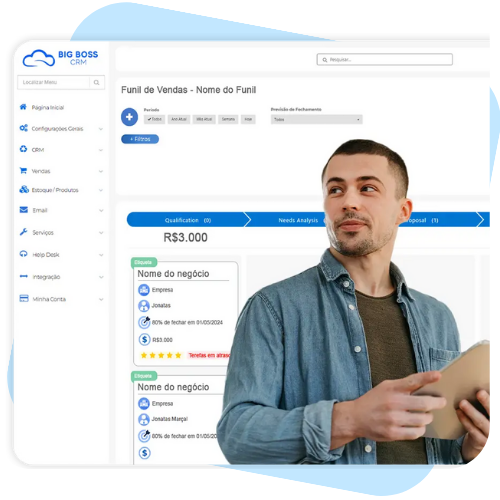 A Big Boss conecta todas as áreas do negócio em um único fluxo, do primeiro lead ao faturamento e ao suporte.