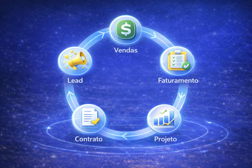 Integração total entre vendas, financeiro e execução em um único ecossistema empresarial.
